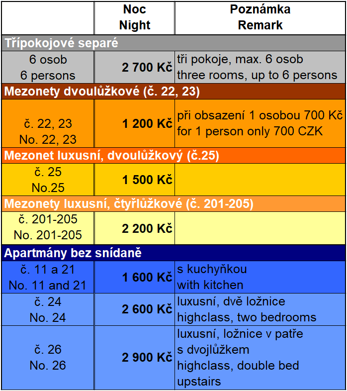 UBYTOVÁNÍ - CENÍK